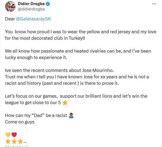 Futbolculuk mesleğinde Galatasaray’da forma giyen Didier Drogba, sarı-kırmızılı topluluğa yönelik iletisinde “Sevgili Galatasaray, sarı-kırmızılı formayı giymenin benim için ne kadar gurur verici olduğunu ve Türkiye’nin en çok kupa kazanan kulübüne olan sevgimi biliyorsunuz. Rekabetlerin ne kadar tutkulu ve hararetli olabileceğini hepimiz biliyoruz ve ben bunu deneyimleyecek kadar şanslıydım. Son vakitlerde Jose Mourinho hakkında yapılan yorumları gördüm. Bana itimadın, Jose’yi 25 yıldır tanıyorum ve o bir ırkçı değil; tarih bunu kanıtlıyor.” tabirlerini kullandı.